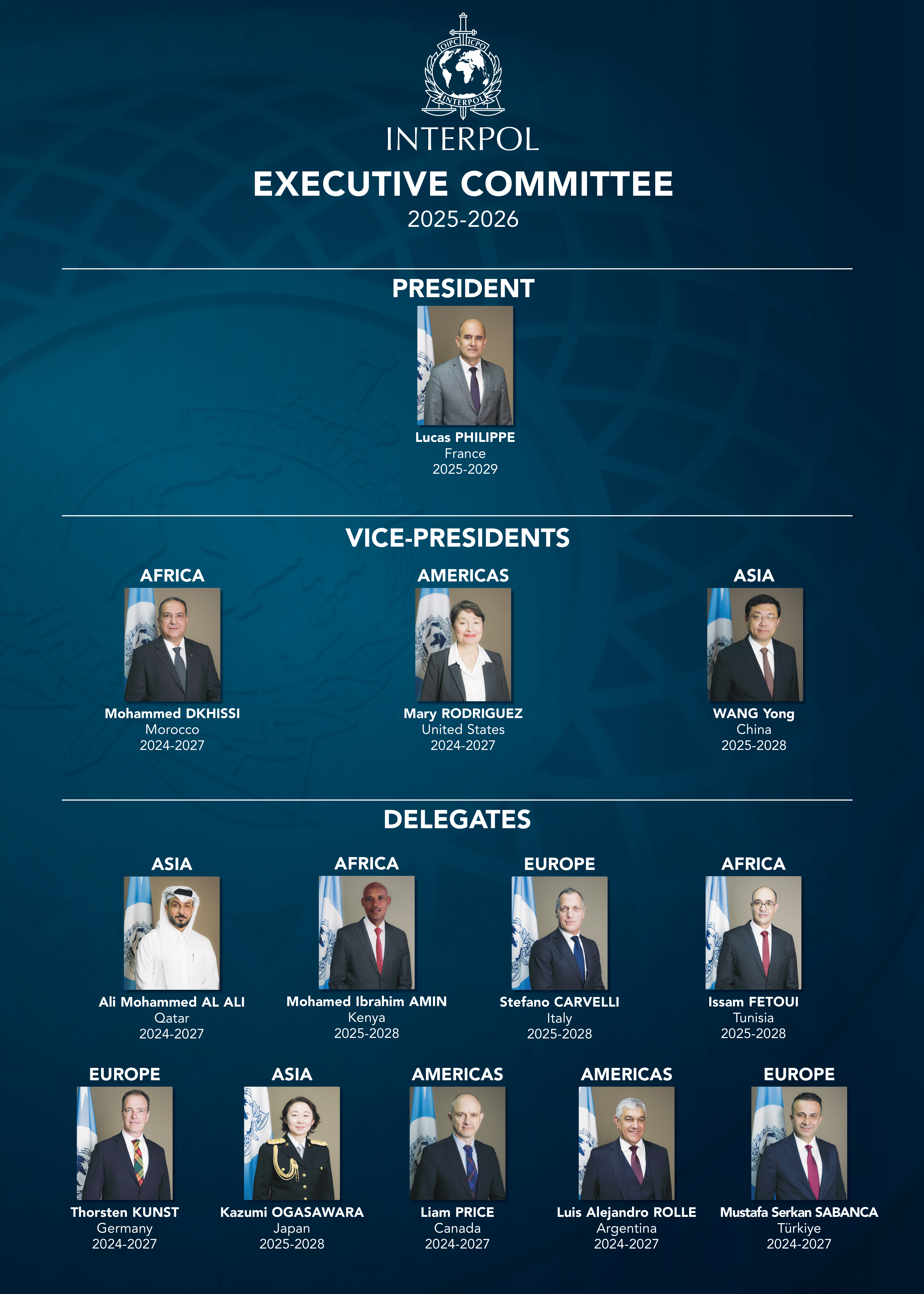 El Comité Ejecutivo (CE) se reúne tres veces al año y establece la política y la orientación de la Organización. Sus miembros ocupan los más altos puestos policiales en sus respectivos países y aportan muchos años de experiencia y conocimientos para aconsejarnos y orientarnos.